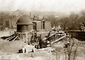 8. The first part of the Creighton Observatory, a brick round house with a revolving dome, was constructed in 1886, while the rectangular transit room was finished the following year. The one-story building received a makeover in 1910 when the extension of 24th Street cut away part of the hill on which the observatory was located. |