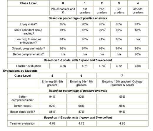 At the conclusion of each program, course participants (Program 5-7) or their parents (Program R-4) fill out program evaluations. The following is a summary of the course evaluations completed by people who participated in Institute of Reading Development classes during 2004.