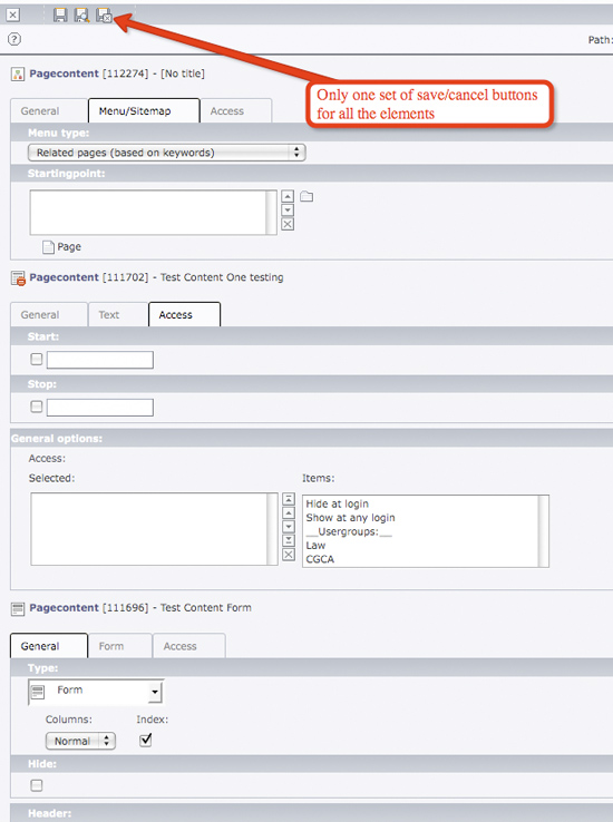 The work area will then have all the content elements that you marked, with all the tabs for each. It will however, only have one set of save/cancel buttons. Make all the edits to all the elements, then save them all at the same time.