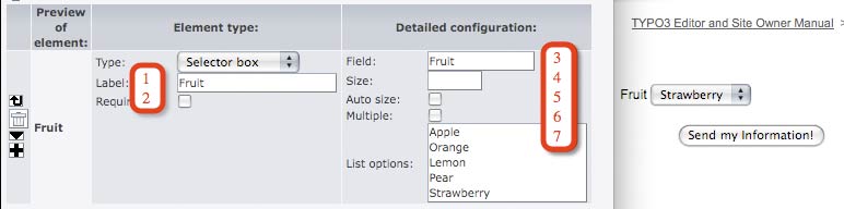 - Field - Actually this should say "Name", each field has it's own name which assists in identifying which field is which. If there are any spaces entered here, Typo3 will replace them with an underscore. The field/name is not seen by the user.