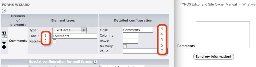 - Field - Actually this should say "Name", each field has it's own name which assists in identifying which field is which. If there are any spaces entered here, Typo3 will replace them with an underscore. The field/name is not seen by the user.