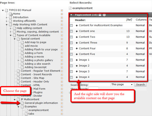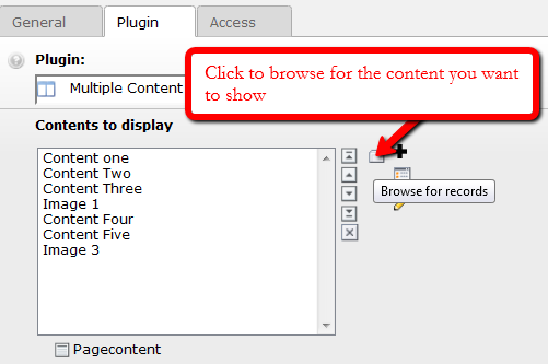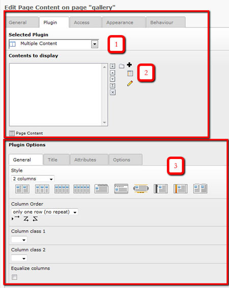 - This is where you chose what content you wish to show in your layout. How you organize this content is up to you. It does not matter if the content is all on one page or from many pages. No matter how you organize it all options in Multiple Content work with individual content elements.