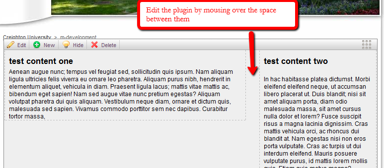 To edit the plugin, mouse over the space between the two content elements: