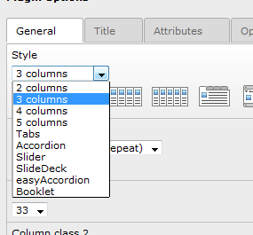 - General - this is where you will change the plugin style (whether or not it's tabs, columns or a slider). This tab is where each style's options are displayed.