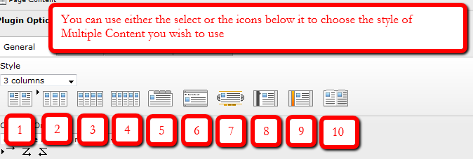 - Options - these are special options for the style you've chosen. This is one place that 95% of users won't want play with. Often it's Javascript. Each description of each style of Multiple Content you can choose will have a link to the available options. I have only 5 words for those who wan to try this "Try at your own risk".