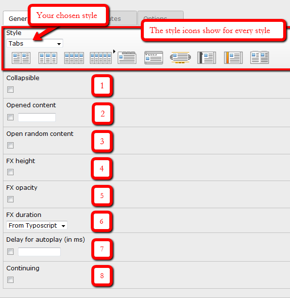 “Opened content”: Defines the content witch is opened at startup. If define “0” no tab is active (closed at startup). Remember the numbering starts at 0 so if you have 4 tabs it would be 0,1,2,3.
