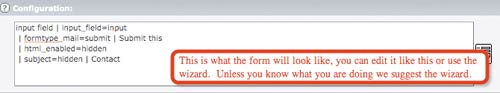 - Configuration - this is where you will see the straight code that creates your form. An image of this filled in is below. Rather than try to change the code, we suggest you use the wizard.
