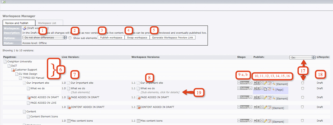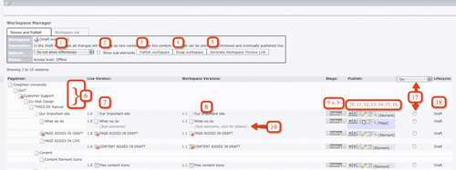 9.  Stage, a) demote or reject, b promote to Review or to publish.  The center will show what stage it is in.  As the element goes through each cycle, the number of times it goes through is shown to the right of this.  (4) means that this element has gone through 4 stages.