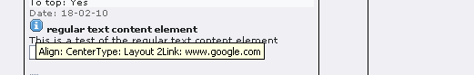 - Information - this is not a clickable icon. if you mouse over it (see below) it will give you more information about the content element such as what alignment it has if it has an alignment, what link the header has if you've given the header a link.