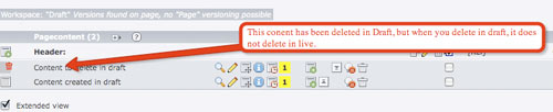 Wait it appears that nothing happens, the page or the content element is still there. But look closer. The number is gone from the Versioning column. What you did was delete the version, not the element.