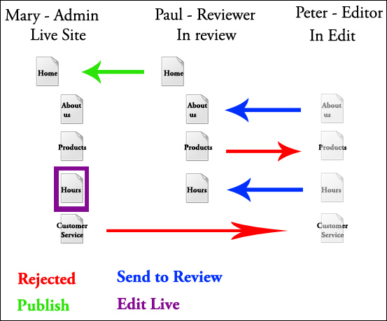 So in the illustration below, Peter has edited, "About Us" and "Hours" and has sent these two pages to review. Paul has rejected "Products" sending it back to Peter to be re-edited, and he has send the approved edits on "Home" onto Mary the admin to publish. Mary has rejected the reviewed edits on "Customer Service" and sent them back to Peter for re-editing.