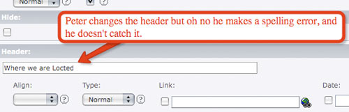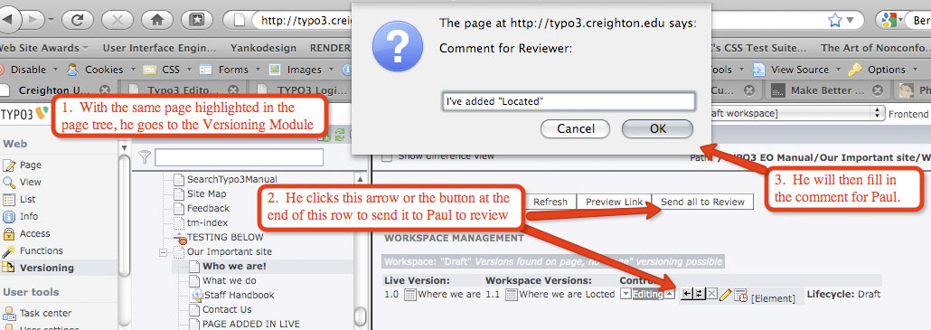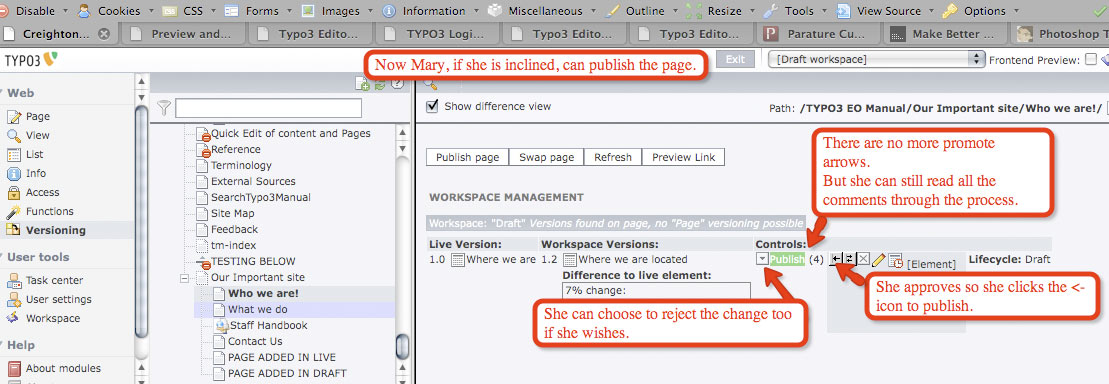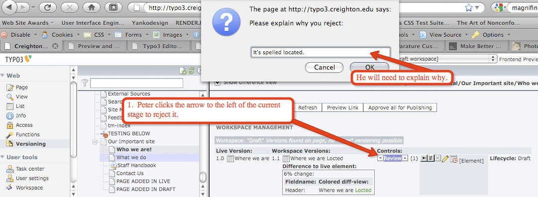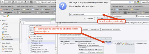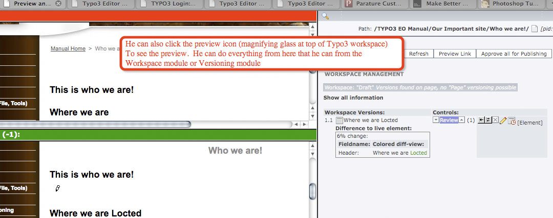 Not noticing that he's spelled located locted, he clicks on the Versioning Module with the same page highlighted in the pagetree (Note: Workspace module can also be used for this. However if you have a huge site with dozens of drafts, it might be hard to find this one change).