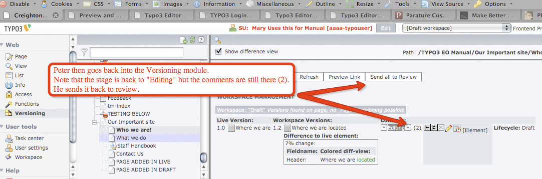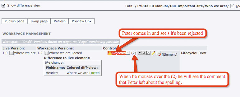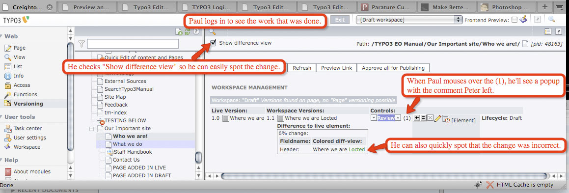 Paul logs in to check the change, he highlights the page in the pagetree and goes to the Versioning module and checks the "Show difference view" to see exactly what was done. He can mouse over the (1) to see the comment Peter added about the change.
