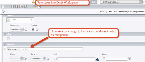 Peter goes into the Draft workspace to change "Where we are" to "Where we are located" on our "Who we are" page.