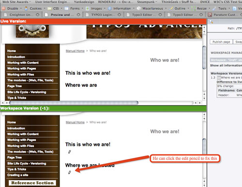 He then clicks the "View Webpage" icon to see his change on the webpage (still not noticing that it's misspelled).