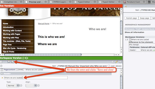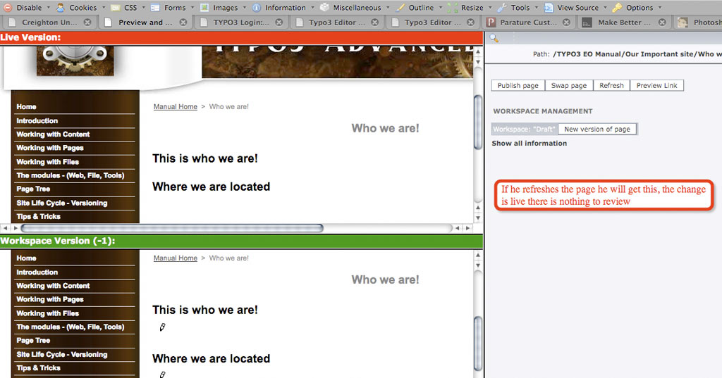 Again, when Creighton upgraded to the Typo3 version that offered versioning and workspaces, there was little to no documentation on this feature. And the staff for the entire web site was very limited. And as time passed and newer versions implemented, this feature was not explored or the suggested methodology adopted. Until recently we did not really know how many people used versioning, or the workspaces.