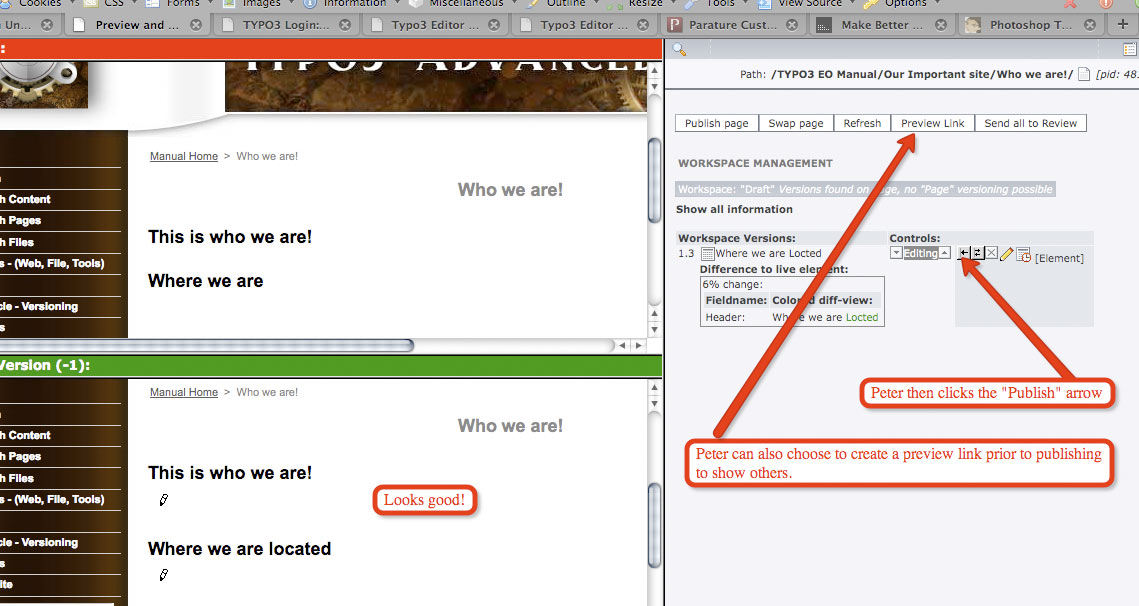 Now it's fixed, he can the <- icon to publish the content or he can choose to create a "Preview Link" to send to others to check the change (the preview link will stay active for 48 hours. The preview is not accessible from anywhere but the generated link).