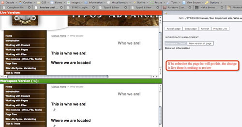 Sometime in the near future we'll be upgrading Typo3 5.0 from version 4.x. This will be a change (as well as huge improvement) for our users. At that time I hope to implement Versioning the way the the developers expected it to be used.