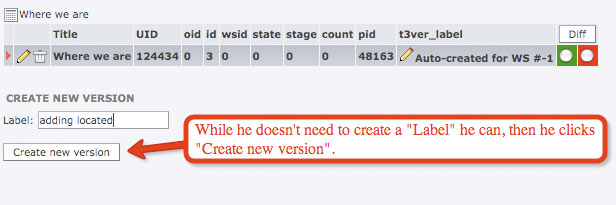 In the Display Workspace work area, Peter clicks "Create new version" to make his change in (He labels it but does not need to label it).