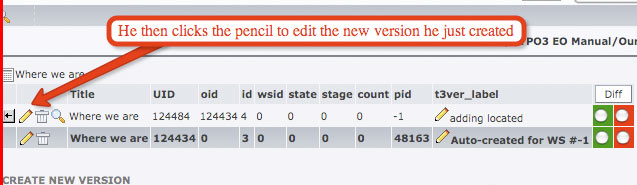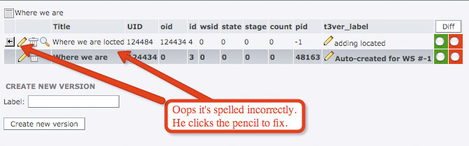 Once he has his version to make the change to, he clicks the pencil to the left of the title to edit it.