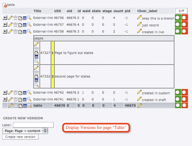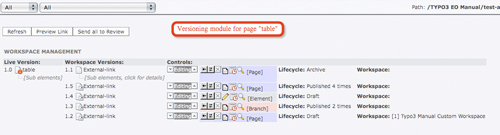 The page "Table" in Display Versions and "Versioning" in the contextual module:
