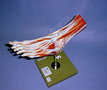 Life size, dissectible into 8 parts. Muscles of foot with lower leg. Plantar fascia and superficial muscles removable to show deep structures.