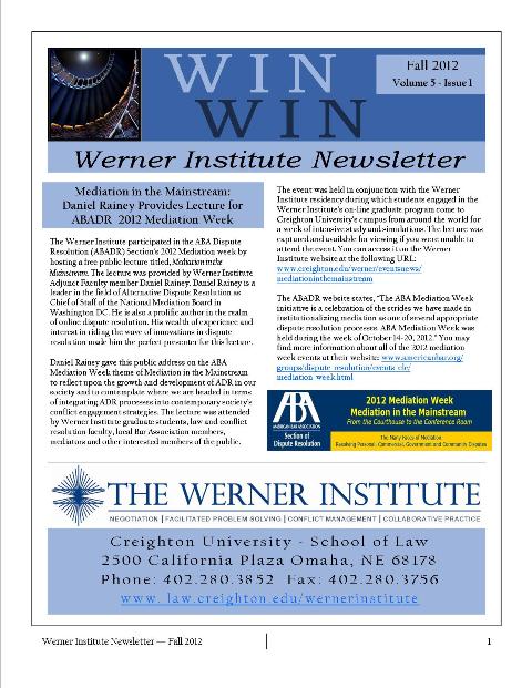 The Werner Institute Newsletter provides an opportunity for the Werner Institute to share the exciting news and events that occur at the Werner Institute and within the lives of the faculty, staff and students in relation to the field of conflict resolution. The first newsletter was released in the fall semester of 2008 and will continue to be released each semester. | |
