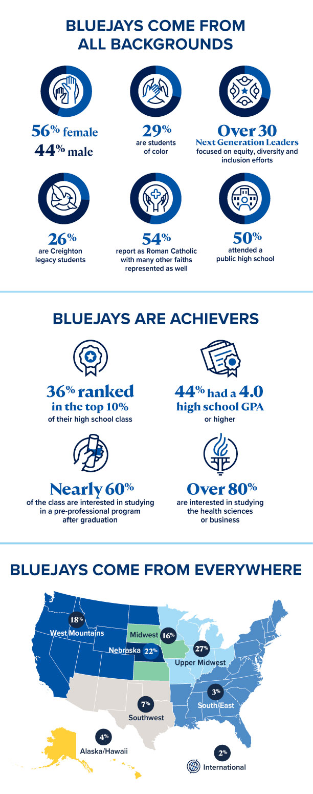 Creighton embraces and thrives in diversity — not only demographic diversity, but also intellectual and experiential diversity. Our students come from all walks of life, bringing with them fresh, stimulating ideas and horizon-expanding stories.
