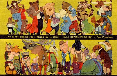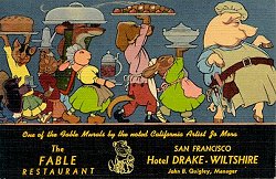 1925? "The Fable Restaurant" postcard with murals by Jo Mora, advertising The Fable Restaurant in San Francisco's Hotel Drake-Wiltshire. 5 3/8" x 3½". C.T. Art-Colortone. Genuine Curteich, Chicago. $16.69 from Gary Moretta, San Diego, CA, through Ebay, June, '00.