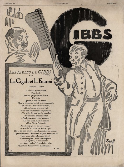 1929 "Les Fables de Gibbs." Signed "Erel." 11¾ x 15¾". GA (Feb. 9), WL (Feb. 25), and MM (May 4). €10 for "beard cream" from Clignancourt, July, '19. €4 each for tooth care from anciendocument through Ebay, June, '20. €4.30 for "Mountain About to Give Birth" (March 2, 1929) from ladymary-fr on Ebay, Sept., '23.