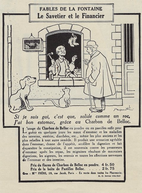 1924 Twenty-three advertisements (and three duplicates) for various products using the artistry of Benjamin Rabier. All printed sometime in 1924 in L'Illustration. Products include Dentol, Regnauld Cream, and Goudron Guyot. €53 from Champy50 on Ebay, June, '20. GA for €8 and "Cobbler and Financier" for €6.50 from authenticpubs on Ebay, Sept., '21. "Wolf Become Shepherd" for €3 from art.deco.ads on Ebay, Oct., '21. Three further advertisements for €3 each from anciendocument through Ebay, Oct., '21. Three further advertisements from AuthenticPubs through Ebay.fr, Oct., '21.