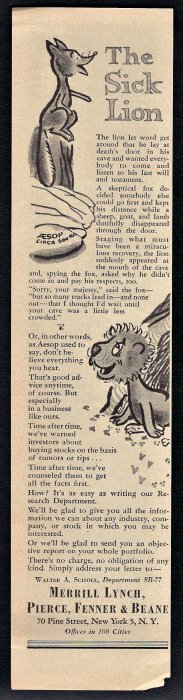 In the 1950's Merrill Lynch did a set of one-column black and white advertisements telling fables, attributing them to Aesop, offering for each an illustration, an application of the fable to investing, and an offer of help in answer to inquiries. The artist signs himself as Van Scheiber or Schierber or something similar. My copies all come from 237 studio on Ebay for $6 to $10. The first came to me in 2006 and the others in 2024. That is perseverance on the part of both of us!