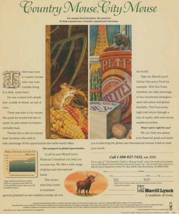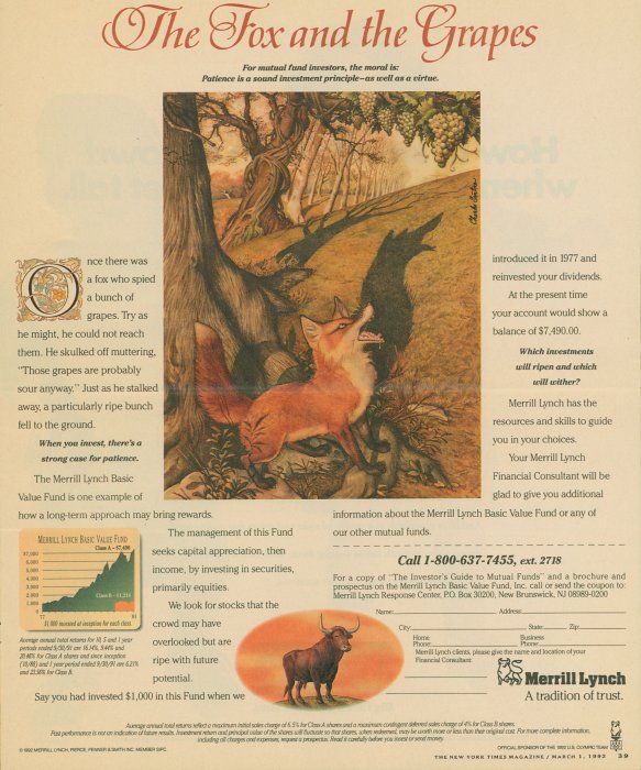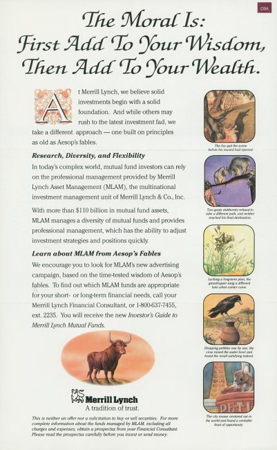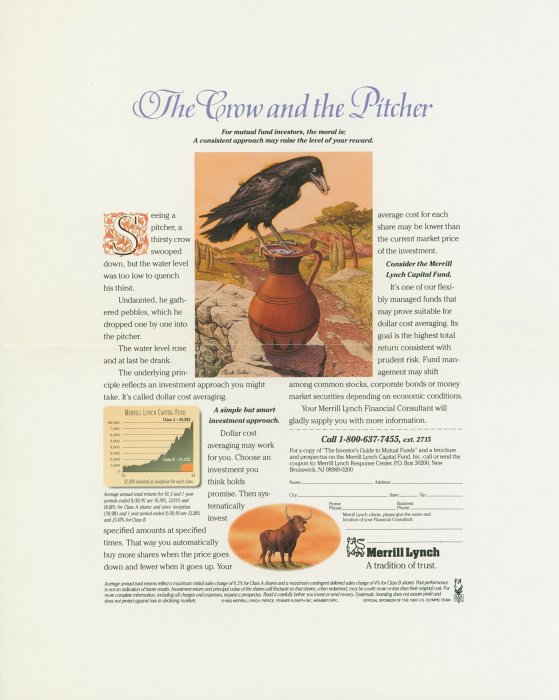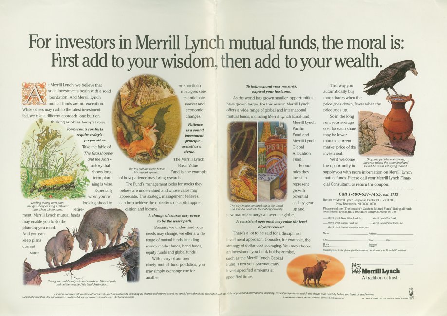 1992 Ad copy for Merrill Lynch's advertising campaign: glossy pictures, large format, big margins. CP, FG, TMCM, "The Legend of the Dragon," and a double-sized spread including GA, "Two Goats," FG, TMCM, and CP. All are ©Merrill Lynch, Pierce, Fenner & Smith,Inc. Gift of Mary Pat Ryan, Summer, '92. See also under books the 1992 pamphlet "The Investor's Guide to Merrill Lynch Mutual Funds."
