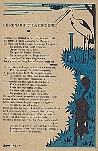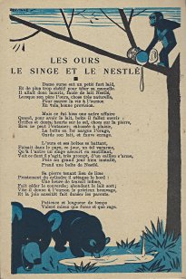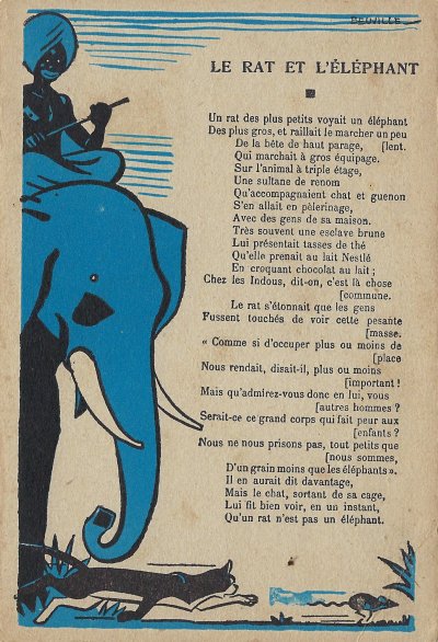 Because in many ways the backs of these cards are more interesting than the fronts, I will include each here. They seem to be tips for pupils, always including an advertisement for Nestlé chocolate in one form or another. Some backs recommend reaching to Nestlé during the times when one gets hungry between meals, for example. The "applied" fables seem to me to be forced, as when a monkey's opening a can of Nestlé saves the day for a bear family. The true story of FG turns out to include a young student who had his Nestlé and knew that the grapes were good. He got one of them! The versos offer fascinating inquiries. "Did you do your work this week?" "Let's make a collection!" "When your grandparents were babies." "Do you like dishes with cream?" My, what questions! 4¾' x 7".