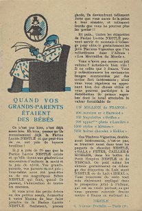 1930? Seven Nestlé advertising cards. Text and illustration on the front side of each card in duochrome black and blue. The verso of each, in black and one other color, has questions, suggestions, and a mention of Nestlé. $42 from Bertrand Cocq, Calonne Ricquart, France, Sept., '18. Four further cards for £1 each from 18otmus through Ebay, August, '21.