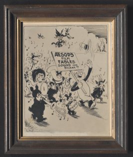1928? "Aesop's Film Fables, Sound and Silent!!" Framed advertisement. Image 7" x 9". Overall 10" x 12". Unknown source. Well, the characters are certainly active! I am surprised that a quick search on Google did not yield other copies of this advertisement.
