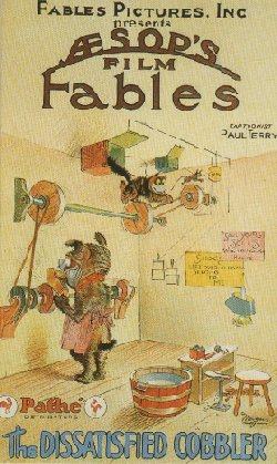 | 1922/80? "The Dissatisfied Cobbler" movie poster. "Fables Pictures, Inc., presents Aesop's Film Fables. Cartoonist: Paul Terry. Pathé Distributors." The original of this poster was released on 2/8/22. Matted and framed. $7.95 from Bob McDaniel, Lima, NY, through Ebay, May, '99.