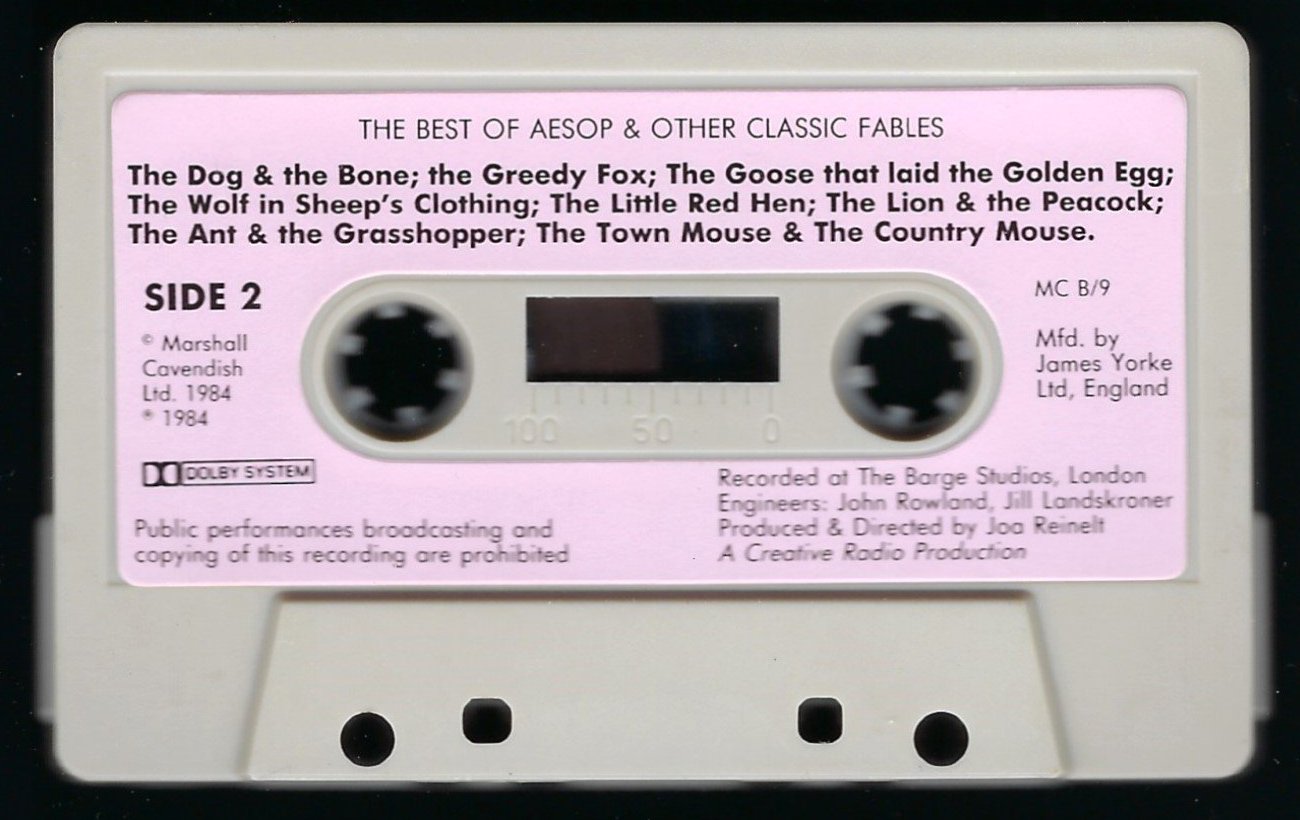2000 Aesop's Fables. Read by Anton Lesser. 79 minutes. Naxos Audio Books. NA 120714. Junior Classics. Selected and produced by Nicolas Soames. Edited by Sara Butcher. I found a German seal on this tape, but have no idea where I obtained it!