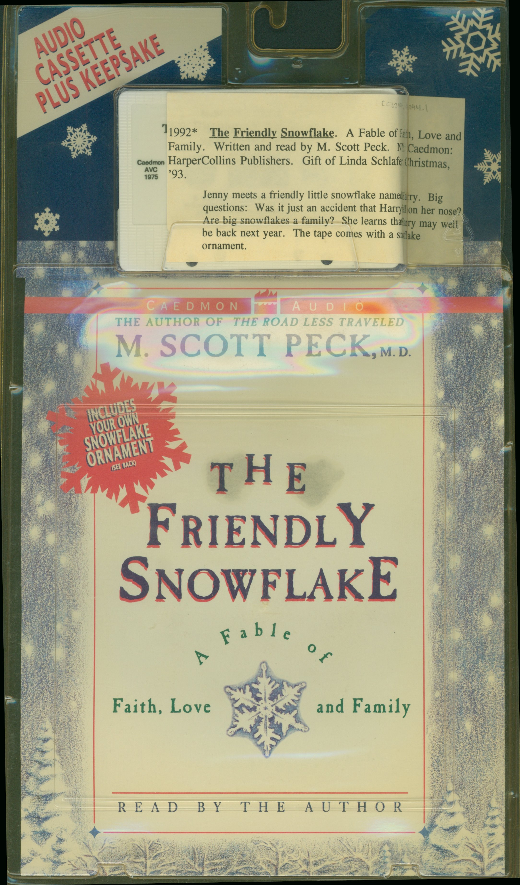 1992 The Friendly Snowflake. A Fable of Faith, Love and Family. Written and read by M. Scott Peck. NY: Caedmon: HarperCollins Publishers. Gift of Linda Schlafer, Christmas, '93.