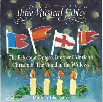 The three stories are "The Reluctant Dragon" with words by David Grant based on a story by Kenneth Grahame, "Brother Heinrich's Christmas" with story and music by John Rutter, and "The Wind in the Willows" with words by David Grant based on the book by Kenneth Grahame. The album is directed especially to Christmas. "Fable" here means "fairy tale." It is a real pleasure to hear both the excellent singing and the clear articulation by singers and readers. The whole production is tasteful, from text to performance. For a special treat, do not miss the sound of Toad's car in the third fable. I also have this presentation on an audio cassette.