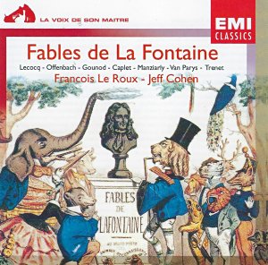 1991 Fables de La Fontaine. CD. Fables as songs by Lecocq, Offenbach, Gounod, Caplet, de Manziarly, Van Parys, and Trenet. EMI Classics. $17.95 from Gennady Smolyakov, Albuquerque, NM, through Amazon Marketplace, August, '15.