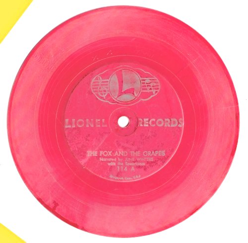 1965? Three 6” Lionel Records: FG/TMCM (114 A & B); LM & OF (115 A & B); “Little Red Hen,” Parts 1 and 2 (112 A & B). Aesop narrated by June Winters and the Speartones. Little Red Hen” narrated by Al Javelon. Bridgeport, CN: Lionel Records. Gift of Susan Carlson, Dec. 18.