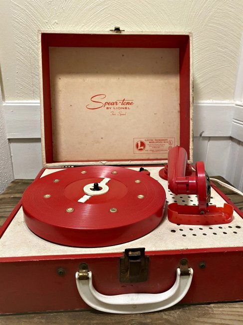 The perfect complement to Susie’s gift came with it: a vintage Speartone Lionel record player! 4200. 78 or 45 rpm. In a suitcase casing. What a pair of gifts!
