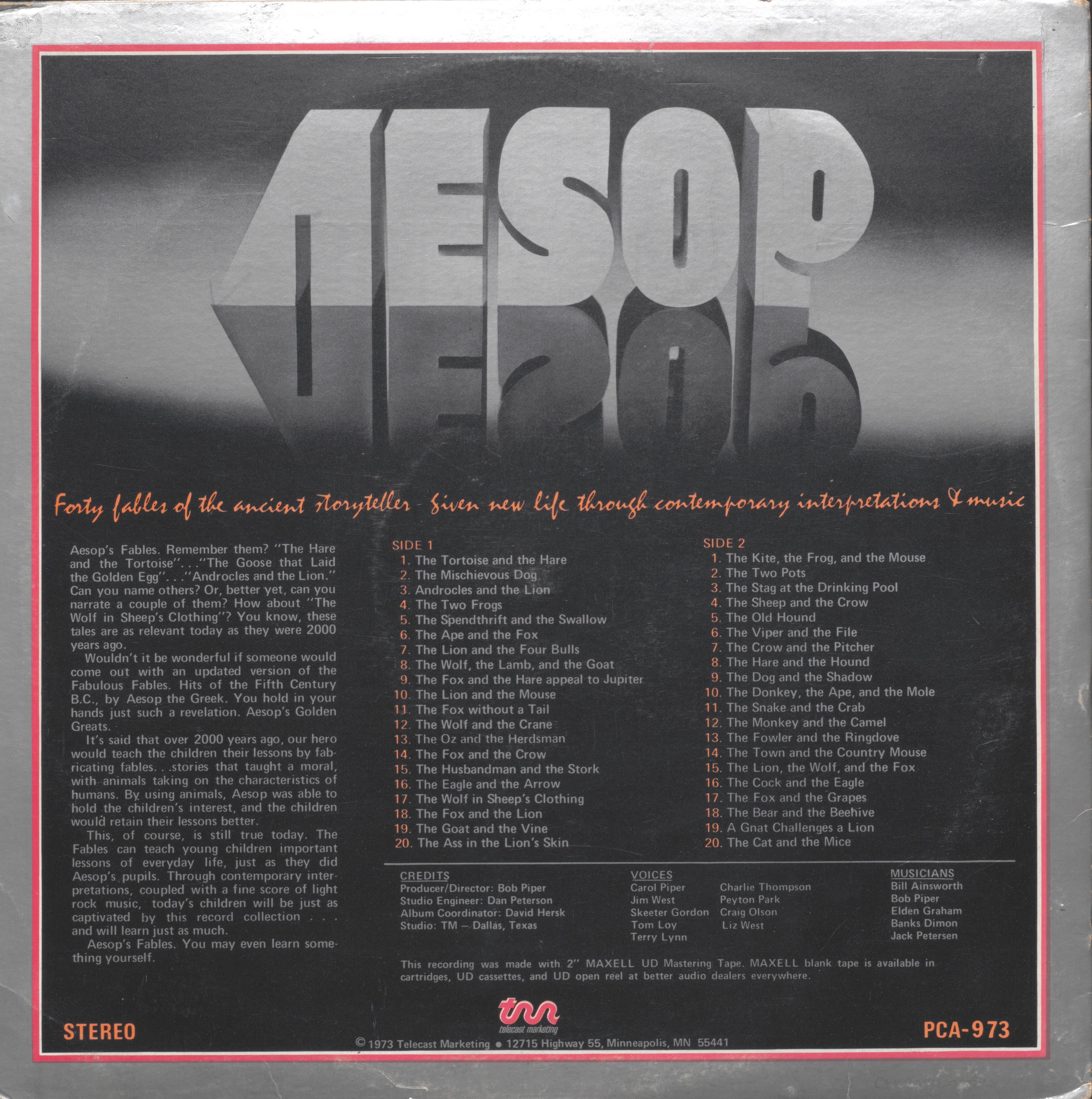 1970? Playhouse Presentation of The Aesop’s Fables. NY: Aim Record Distribution, Inc. Aim S 828. For Sprowls, Silverstein, Reynolds, Seradge, Pratt, A Joint Venture. Unknown source.