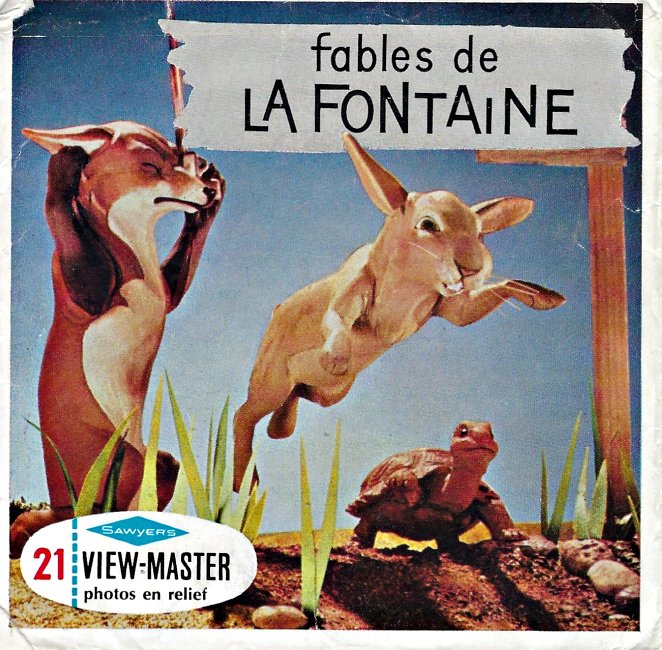 1959 Extra copy of Reel 2 of View-Master Packet No. B 309: “Aesop’s Fables.” Portland, OR: Sawyer's Inc. $5 from Derek Metzer, Luxemburg, WI, through Ebay, May, ’14. Stories on this reel include TMCM: four images. FC: one image. SW: two images. I am cataloguing this little piece seven years after we received it! Cataloguing it gives me a chance to show the interior packaging. | |