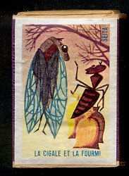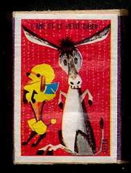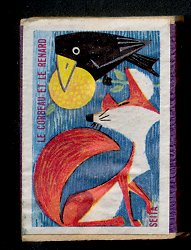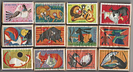 1950? Twenty-nine French matchboxes, each giving the title and an illustration for a fable of either Jean de La Fontaine or Florian. $25.90 from from desallumettesenveuxtuenvoila through eBay, August, '