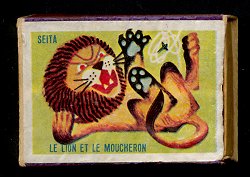 It is comic that I have two sets that are complete except for one matchbox. Luckily, the missing matchbox is not the same in this set as in the other. Here the missing matchbox is "The Lion and the Mosquito." Again, this almost-complete set replicates the full set of covers in both sets of SEITA illustrations, minus the two larger covers apparently used for packages of ten. Their images are thus the same as that set.