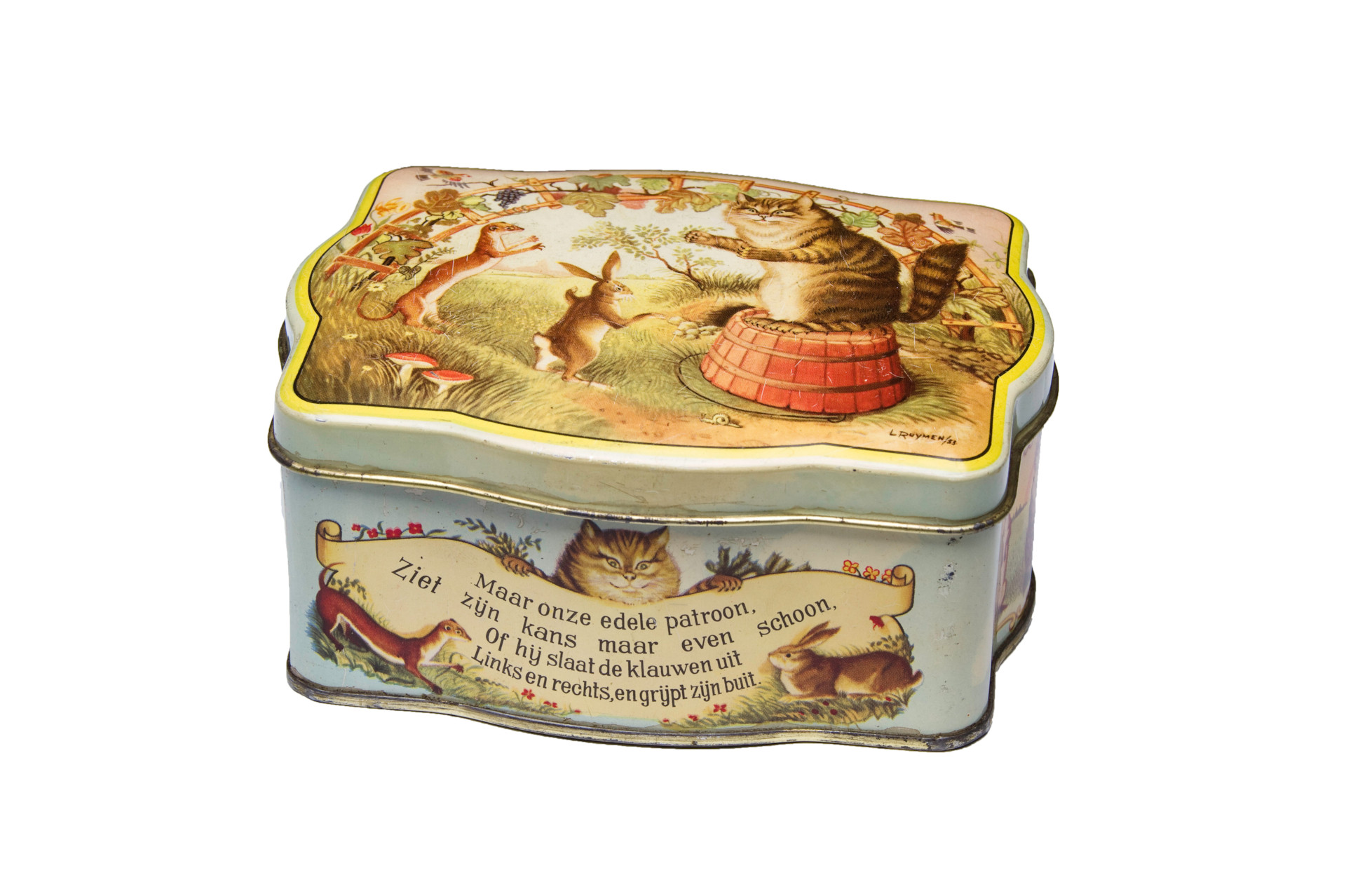 1950? Sirop Melangé Pomona syrup can featuring FS. Dutch (?) poetry and side panels of fox and stork. $15 from sunbeamavenger62 through Ebay, Feb., '23. Here is an older syrup can, so old that it can be hard to read text or image. This is another item whose shipping cost more than the item. The dress and accessories of both characters are lively! |