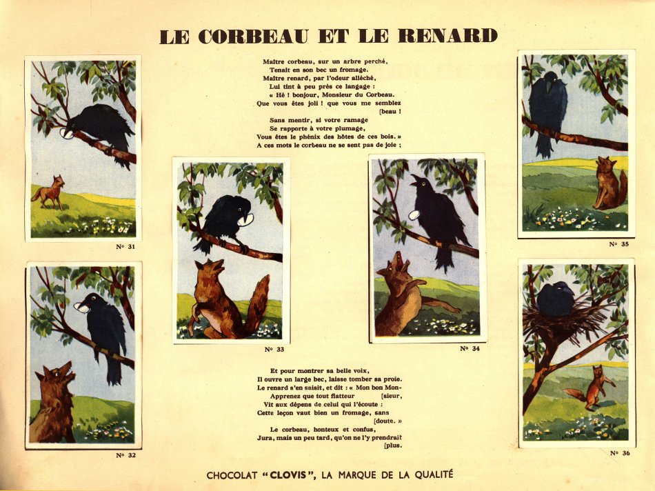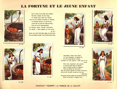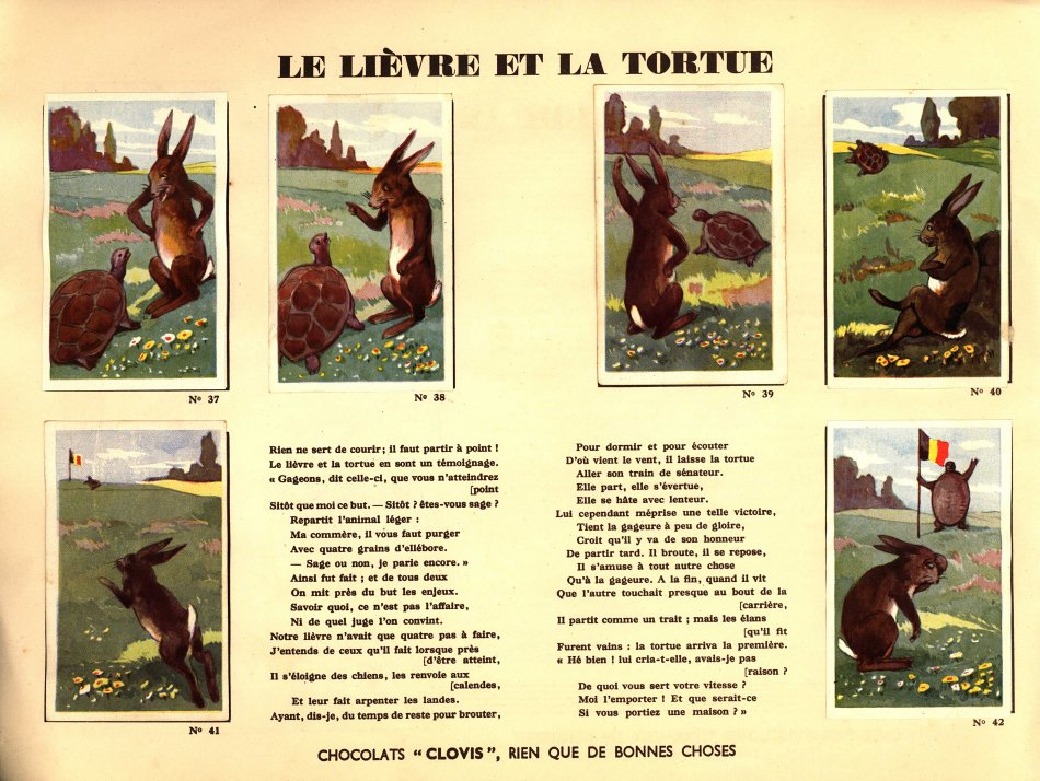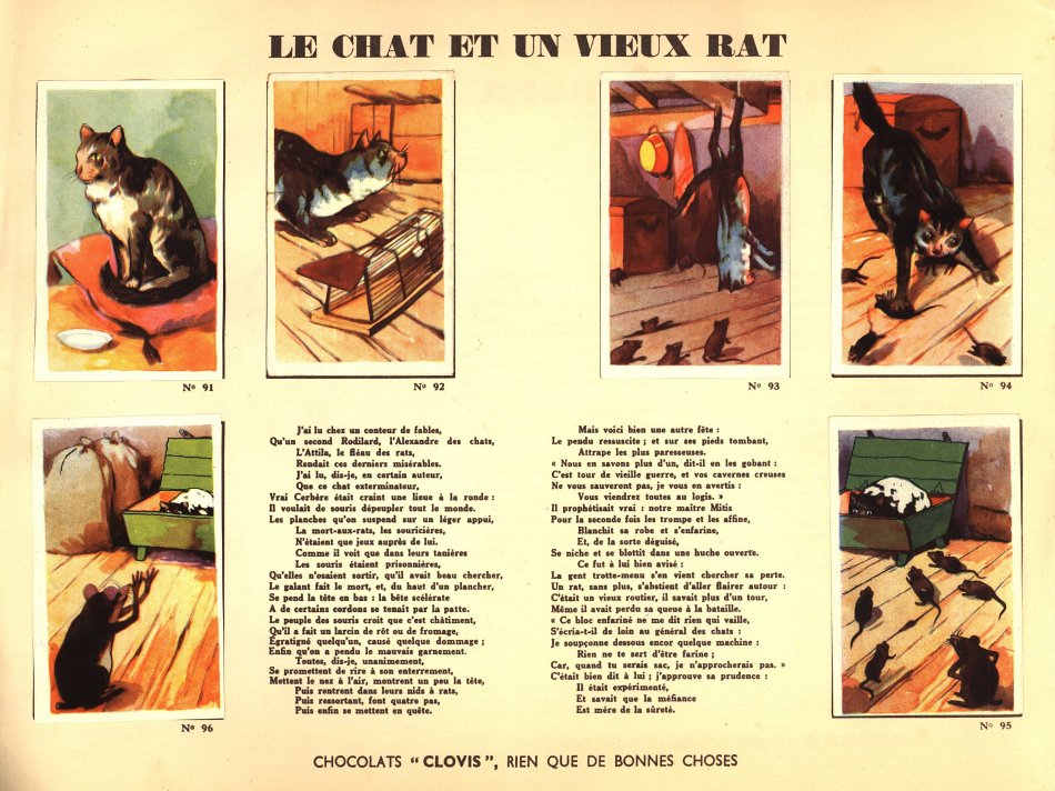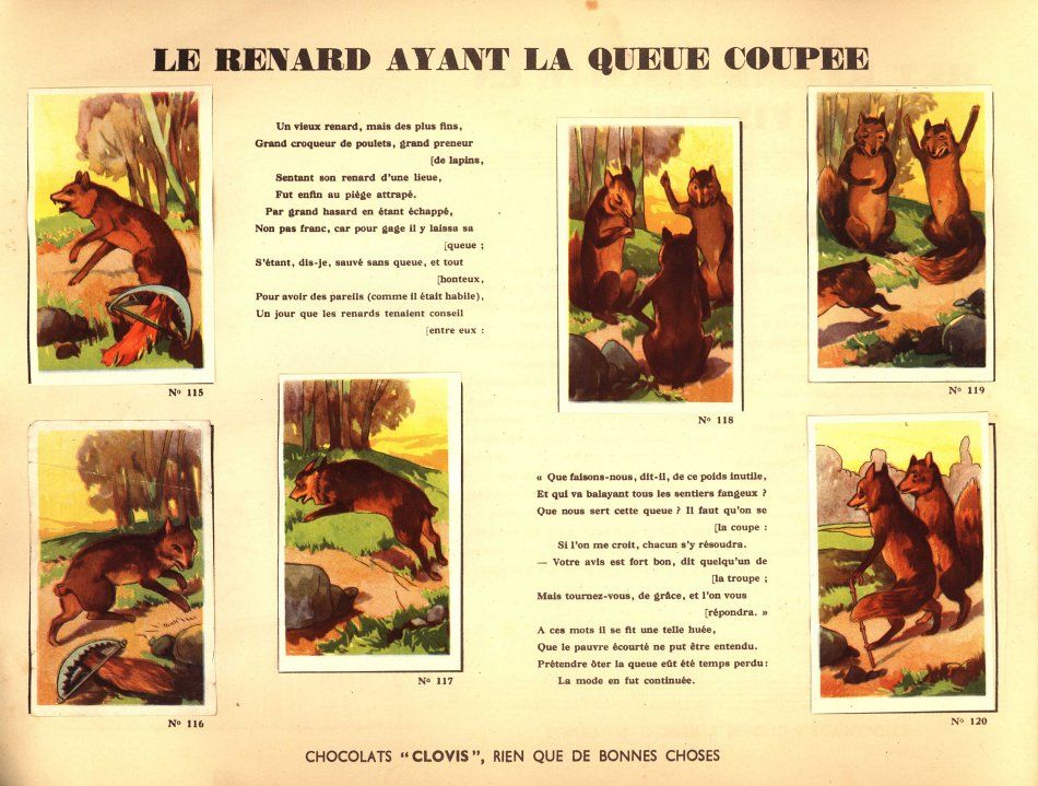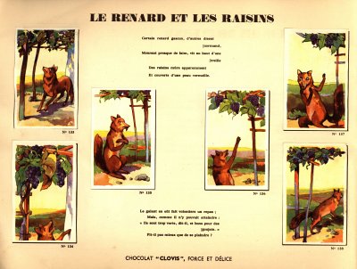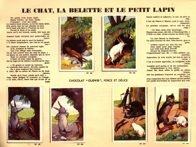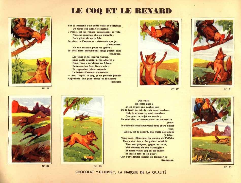 I believe that I had not seen Clovis slips before. This is a very impressive album. Each pair of pages features six slips pasted on the left with La Fontaine's French, with the right-hand page offering the text in Flemish together with a line drawing to color. The six slips are arranged differently on various of the 30 selections here. Albert had to find two missing cards for me. This is another treasure!