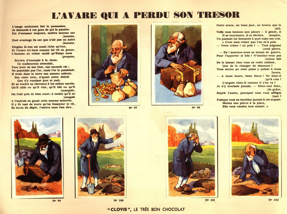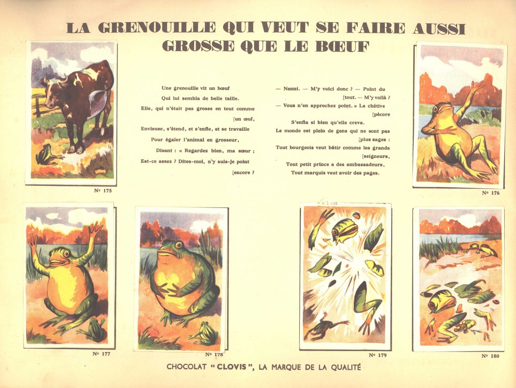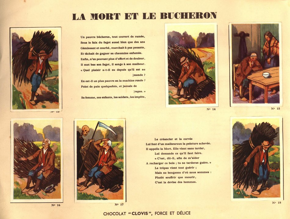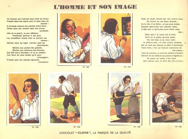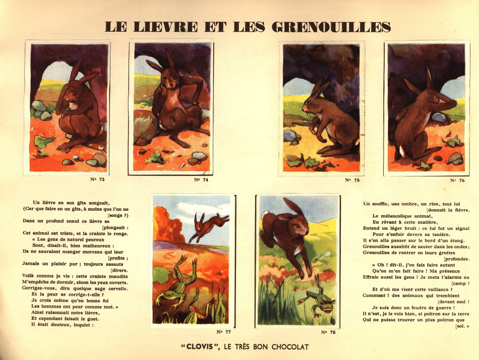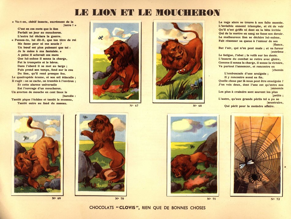 I believe that I had not seen Clovis slips before. This is a very impressive album. Each pair of pages features six slips pasted on the left with La Fontaine's French, with the right-hand page offering the text in Flemish together with a line drawing to color. The six slips are arranged differently on various of the 30 selections here. Albert had to find two missing cards for me. This is another treasure!